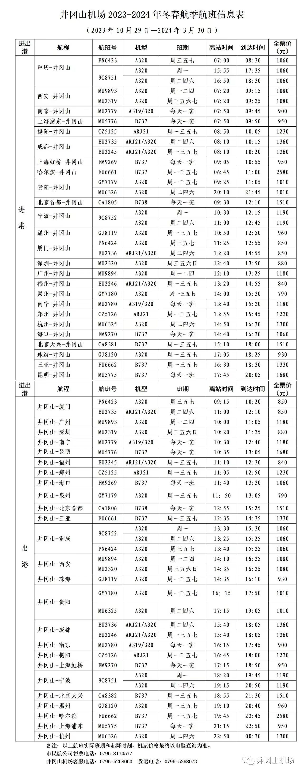 井岡山機場(chǎng)2023~2024年冬春航季航班信息表